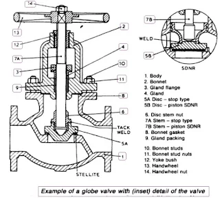 A globe valve has a somewhat spherical body enclosing the valve seat and valve disc . Flanges are provided at either side for connecting to adjacent pipework, and internal passages guide the liquid flow through the valve seat. Liquid flow is always arranged to come from below the valve seat so that the upper chamber is not pressurised when the valve is closed. A screw lift valve arrangement is shown where the spindle is joined to the valve disc. A gland with appropriate packing surrounds the spindle where it leaves the valve bonnet. The upper part of the spindle is threaded and passes through a similarly threaded bridge piece.